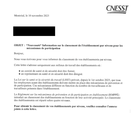 La lettre comprend la liste de chacun de vos établissements inscrits auprès de la CNESST ainsi que le niveau de classement attribué à chacun. Ces niveaux permettent de déterminer, à défaut d’entente ou jusqu’à ce qu’il y ait une entente entre les membres du CSS :