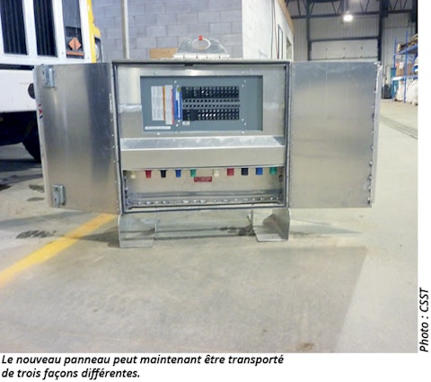 Des nouveaux panneaux ont été fabriqués. Ceux-ci sont munis de deux sections distinctes avec portes et serrures. Les usagers ont accès uniquement aux prises électriques, puisque le panneau de disjoncteurs est verrouillé. Tous les panneaux sont identiques, ce qui facilite l’intervention des électriciens. La manutention a été grandement améliorée par la mise en place d’un crochet de levage et d’autres accessoires offrant trois méthodes de transport différentes. Les nouveaux panneaux sont étanches et munis de disjoncteurs différentiels de fuite à la terre.